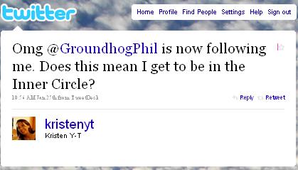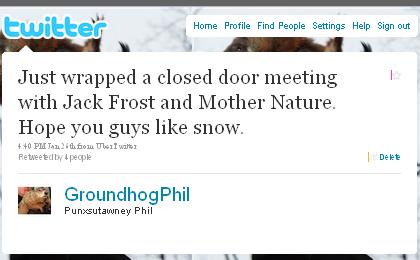 So I went ahead and set Phil up with a Twitter account. @PunxsutawneyPhil was one character longer than Twitter allows, so I went for @GroundhogPhil.