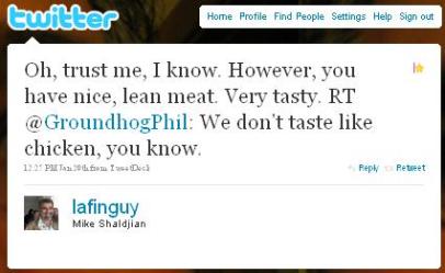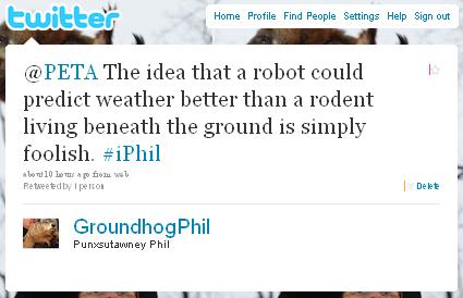 So I’ve continued tweeting as Phil. Yesterday, on the same day as Apple’s iPad announcement, PETA suggested Phil be replaced by a robot.