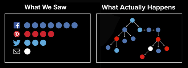 So instead of just seeing your shares in buckets (100 Facebook, 50 Twitter, 30 LinkedIn, etc.) you see exactly how that content spread in a tangled web from it’s original sharer to other channels.