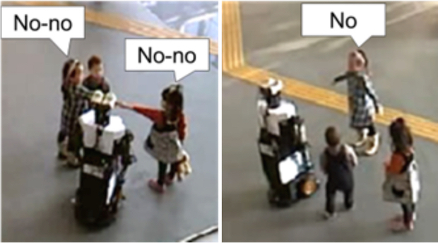 In many instances, the researchers observed children persistently obstructing the robot. Sometimes a child would step aside when asked by the robot, but then would quickly come back in front of it. Other children started ignoring the robot’s requests and just stood in front of it. In at least one situation (above), a child started to verbally express her intention to block the robot (“No-no”), when requested to move. Other children joined her in obstructing the robot and saying it couldn’t go through.