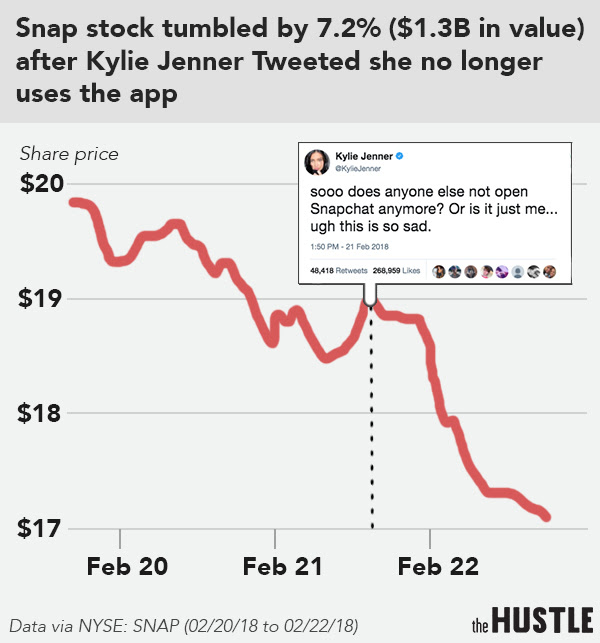 Did Kylie Jenner’s Tweet Cost Snapchat $1.3 Billion? Snapchat’s user-experience has always been a mess, but this latest update spurned more than a million people to sign a Change.org petition to reverse the update. But nobody saw this coming: Reality star Kylie Jenner — Snapchat’s most viewed user by a longshot — tweeted that she doesn’t open the app anymore. And the following day Snap’s shares dropped by as much as 7.2% ($1.3 BILLION LOSS). Whether directly tied to her tweet or the overall decline in active users, Snap is certainly feeling the heat of an influencer scorned today. (LINK)