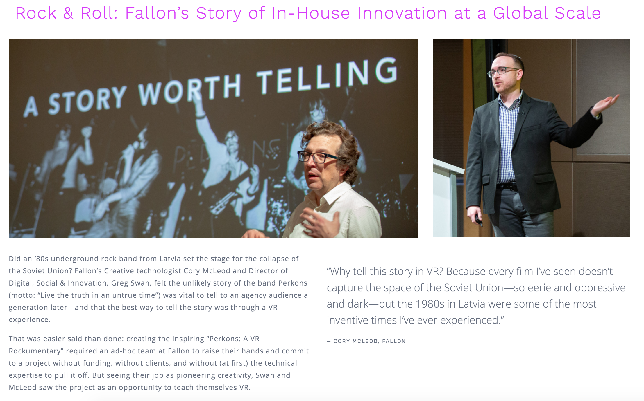 Did an ‘80s underground rock band from Latvia set the stage for the collapse of the Soviet Union? Fallon’s Creative technologist Cory McLeod and Director of Digital, Social & Innovation, Greg Swan, felt the unlikely story of the band Perkons (motto: “Live the truth in an untrue time”) was vital to tell to an agency audience a generation later—and that the best way to tell the story was through a VR experience.–4A’s CreateTech