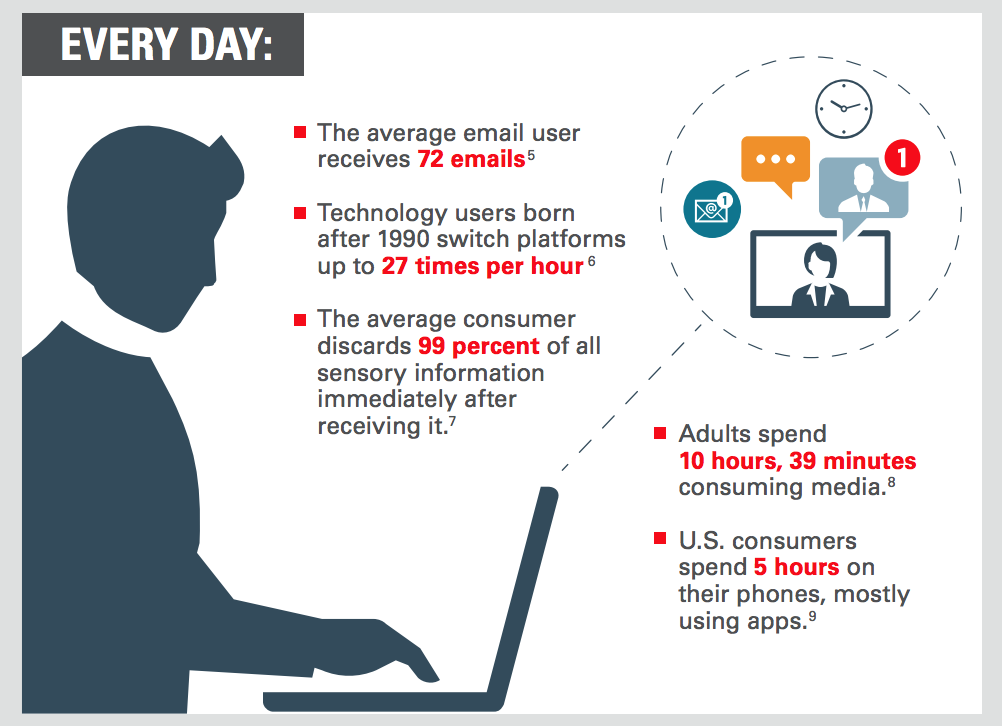 Oracle has a new distracted consumer infographic (PDF) demonstrating the challenge marketers have in capturing and holding a customer’s attention, including a 1 minute breakdown of the # of emails and texts sent, social media updates posted – partnered with our changing media habits. Could be good fodder for you to use in a future presentation.