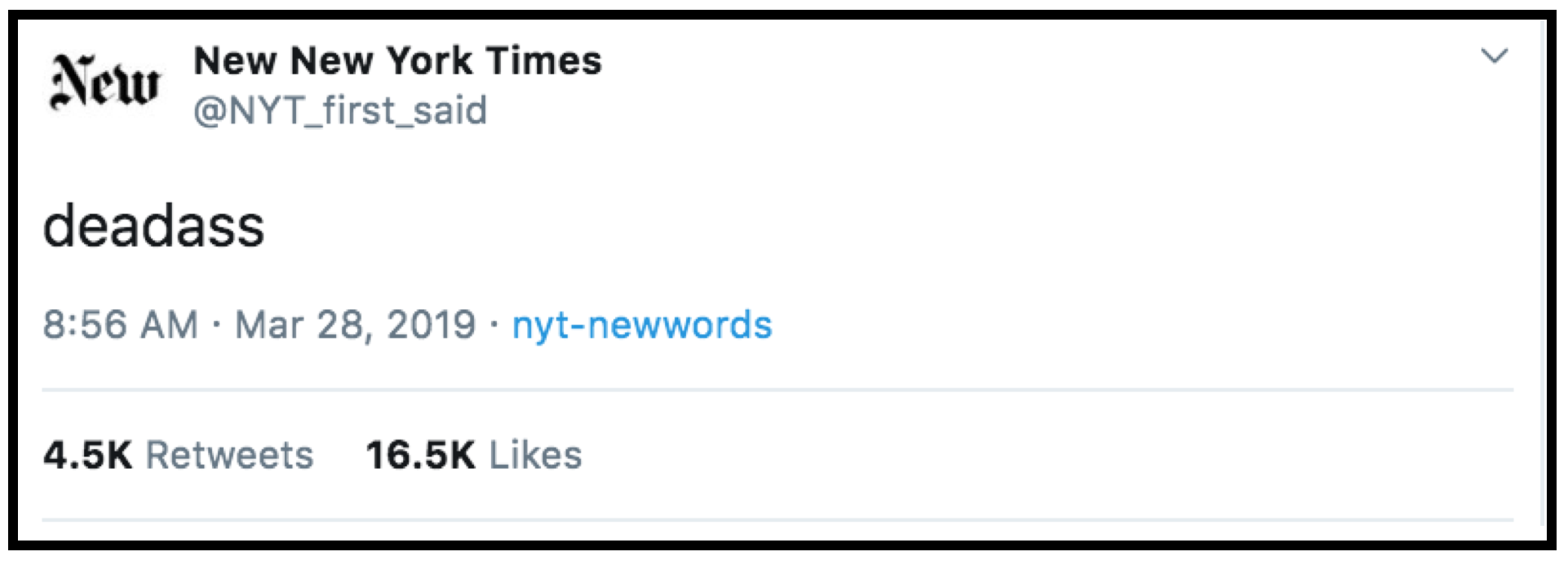 Twitterer of the Week: Move over Merriam-Webster, @NYT_first_said tracks the first time The New York Times uses a word, including colorful slang like “thiccc,” “hypebeasts” and “shooketh.”