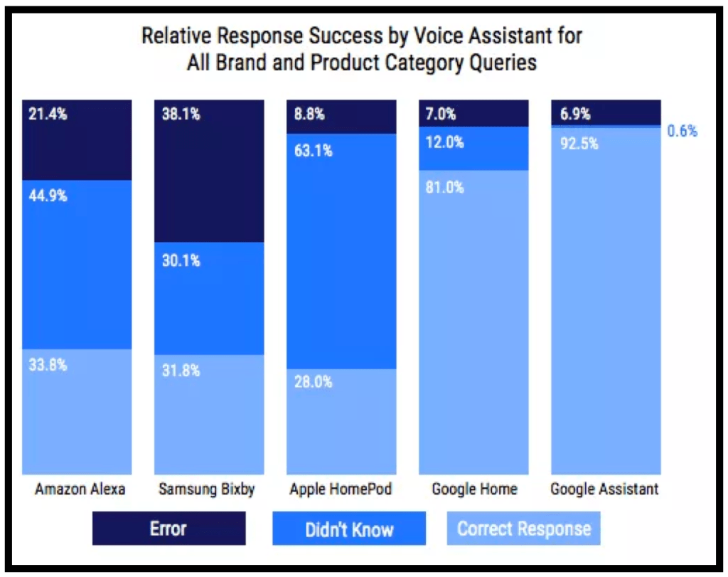 Which Voice A.I. Assistant is the Best? A study asked four voice assistants more than 4,000 questions about brands, ranging from “What is the longest-lasting lipstick?” to “How do I contact JetBlue?” The findings: Google Assistant on a phone offered correct results for 92% of queries, while Google Assistant on a smart speaker hit 81%. Amazon’s Alexa was 34%, Samsung’s Bixby 32%, and Apple’s Siri was 28%.