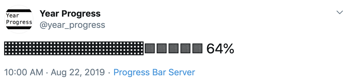 Tweet of the Week: @Year_Progress tweets an ongoing visual progression of how much time has elapsed of the year 2019. Spoiler: it’s 64% today. There’s a version of this for the Trump Presidential term, too.