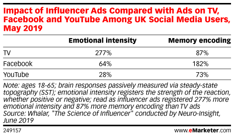 Influencer Ads Create Insane Emotional Intensity: New research analyzed reactions to influencer ads from UK social media users ages 18-65 and looked at subjects’ “emotional intensity” (emotions being felt) and “memory encoding” (committing something to long-term memory). The research showed that influencer ads generated 277% greater emotional intensity and 87% higher memory encoding in participants. There’s some awesome data on “influencer-primed linear TV ads” here too. Check it out.