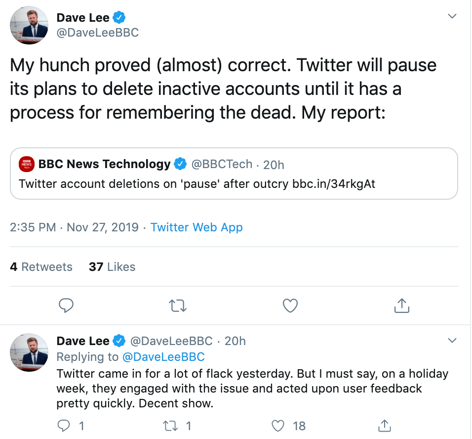 The Great Twitter Purge of 2019 is On Hold: For the first time, Twitter announced it would be deleting EU accounts that have been inactive for more than 6 months. But after outcry about the lack of a memorialization process for deceased users, the purge has been put on hold. For brands, it would still be prudent to regularly log into any accounts you want to keep. This may include those you’ve reserved for brand protection or digital reputation strategy (e.g., brand mascot accounts, C-level executives or frequent misspelling accounts). Twitter sent out emails to users of accounts that would have been affected by the deletions, but it’s good practice to regularly log into “dormant on purpose” accounts to keep them active, especially if you want to avoid deletion if and when Twitter resumes its purge strategy.