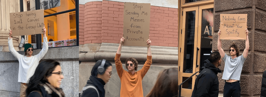 Insta of the Week: @DudeWithSign features a guy holding up hilarious cardboard box signs in NYC crowds, like “’See you next year’ isn’t a funny joke,” “Stop standing up when the plane lands” and “Stop having 1:1 convos in the group chat.”