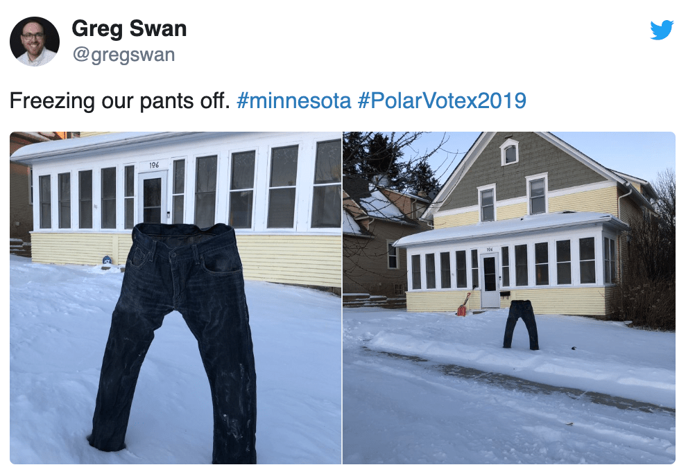AND, this is the one year anniversary of my frozen polar vortex pants going viral. The backstory: My kids had a snow day from school and I said “let’s make something go viral!” And we did! With a big hat tip to Tim Brunelle for the inspiration. My frozen pants pants got picked up by BuzzFeed, IFL Science, BoredPanda, Distractify, Someecards, 22 Words, the front page of Imgur, and news pubs in Canada, Ireland, India, Spain, Japan, and Serbia!!