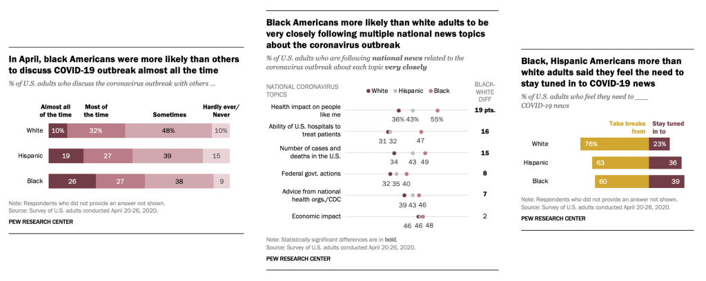 Black U.S. Adults Follow COVID-19 News More Closely: Black Americans, a group that has been hit disproportionately hard by the coronavirus outbreak, have been paying closer attention to many elements of the outbreak – and discussing it more frequently with other people – than other U.S. adults, according to a Pew Research Center survey conducted before nationwide protests began over the murder of George Floyd in Minneapolis.