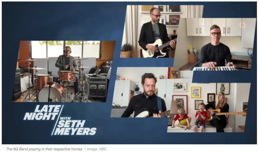 At-Home Tech, Near-Hollywood Quality: Consumer electronics have replaced studios during the pandemic, The Verge has a detailed breakdown of the off-the-shelf gadgets Seth Meyers uses to self-produce Late Night from home: iPad, Sennheiser ClipMic Digital, and Dropbox. And his house band uses Houseparty and Garage Band.