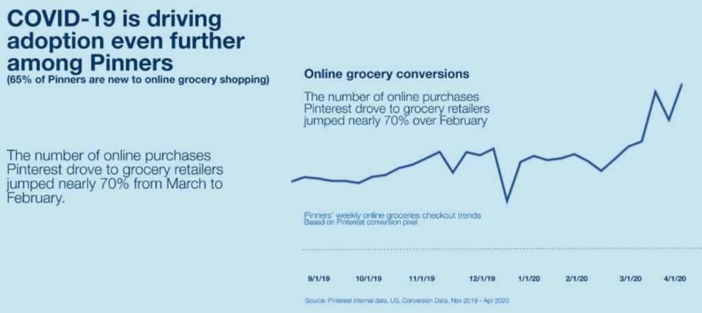 Online Shopping During COVID-19 Exceeds 2019 Holiday Season Levels: According to Adobe’s May 2020 Digital Economy Index (DEI), which tracks the state of e-commerce, online shopping levels during COVID-19 (April to May) were higher than what retailers saw during the 2019 holiday season (November to December), with an extra $52bn spent. Pinterest released new research that shows the number of online purchases it drove for grocery retailers jumped nearly 70%, month-on-month, in March.