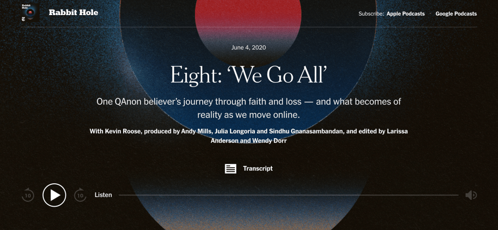 Podcast of the Week: The last episode of Rabbit Hole, Kevin Roose follows a woman who stumbled upon the “Q” community and found herself drawn in. It’s a look at what our exploding culture of influencers, TikTok stars and information disseminators holds for the future. Listen here.