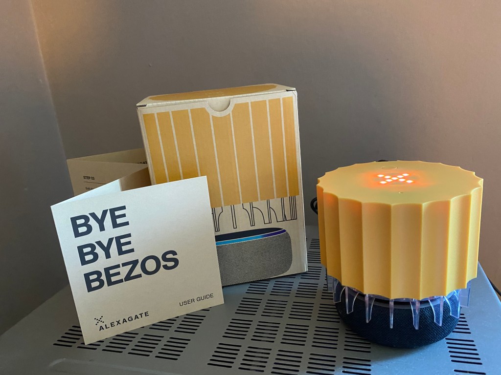 The device sits atop your Echo device and uses 7 ultrasonic speakers to jam your Echo’s mic so it can’t hear you say “Alexa…” or ANYTHING ELSE.