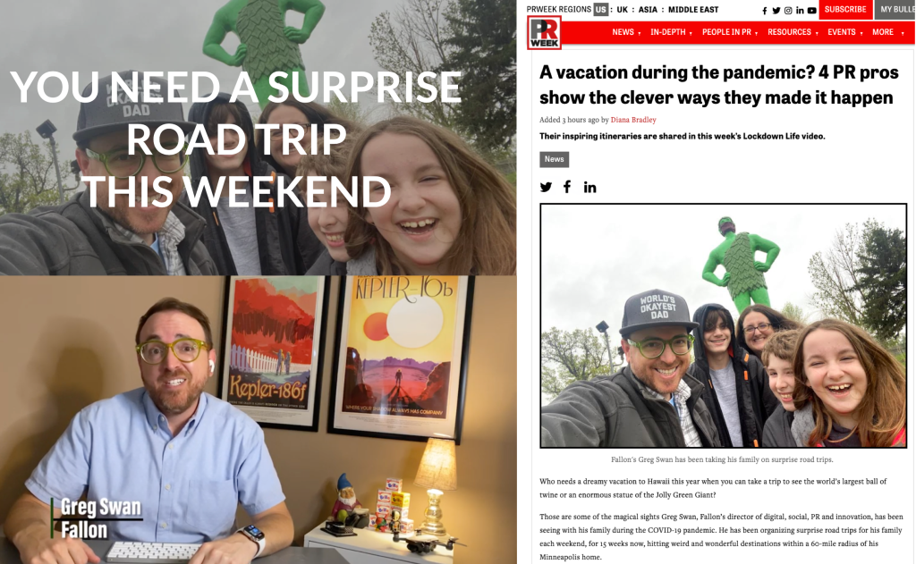 We’ve done it 17 weeks in a row now (see: You Need a Surprise Road Trip This Weekend), including stops at World’s Largest Ball of Twin, Jolly Green Giant, and the Smallest Dedicated Park in the United States! And it caught the attention of PR Week in August: “A Vacation During the Pandemic?”