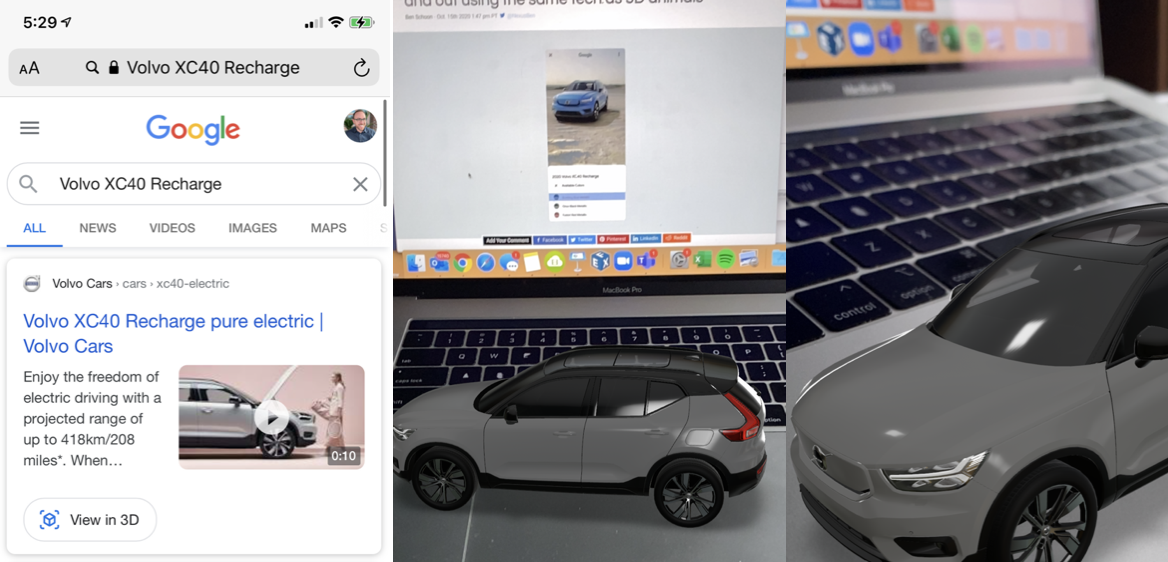 Augmented Reality Comes to Native Google Search: As I predicted, only 16 months after launching augmented reality search for animals Google is now bringing in-search AR results for brands, starting with auto. When searching for supported vehicles, users will see the ability to view a 3D model either on a generic background, a stylized background, or in real-life using AR through the camera directly in the Google search results. In your mobile browser, Google “2020 Volvo XC40 Recharge” and scroll down to the card that says “View in 3D.” Then project it via hologram in your driveway, garage, or living room!