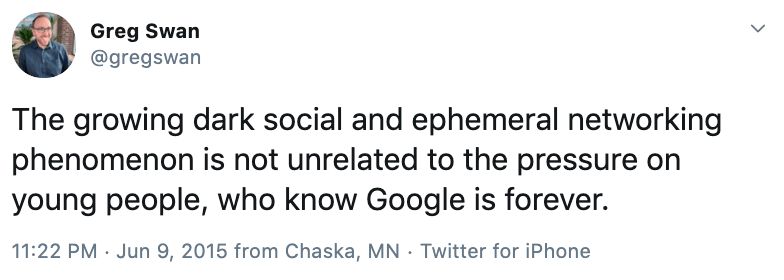 “The growing dark social and ephemeral networking phenomenon is not unrelated to the pressure on young people, who know Google is forever.”