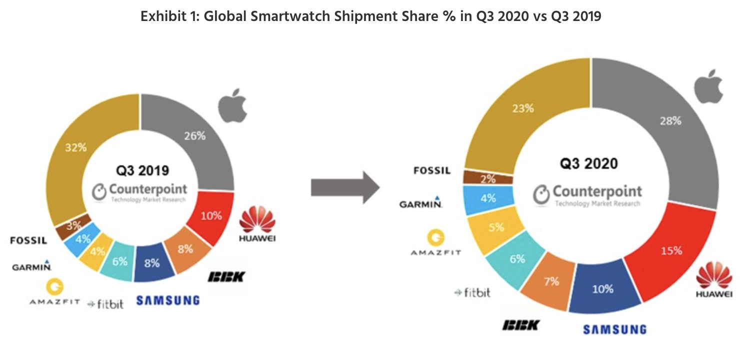 Instead, smartwatches and health tracking devices continued their growth trajectory despite the COVID-19 pandemic, with global smartwatch shipments increasing 6% in Q3 2020 compared to the same period last year, according to the recently published Global Smartwatch Model Tracker of Counterpoint Research. Apple is leading, but there are a lot of players.