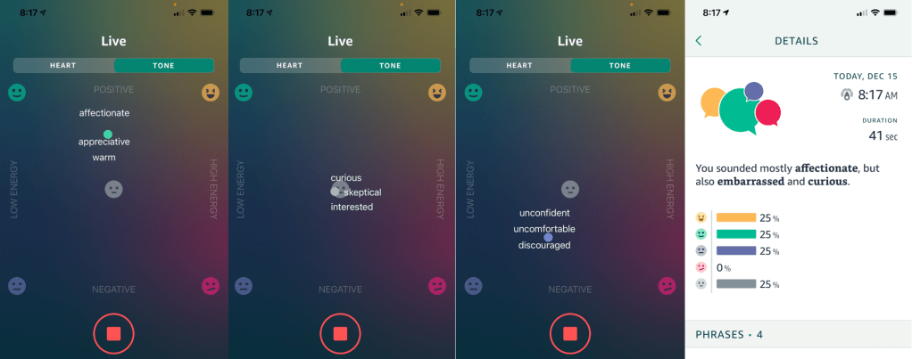 Tone “helps you understand how you sound to others — insights you can use to help improve your relationships and overall well-being.” The device learns your voice and then captures snippets throughout the day and ranks your vocal tone via High/Low Positivity and High/Low Energy. You can use the button on Halo to mute ton monitoring OR to listen to you speak up to 30 minutes and share an analysis.