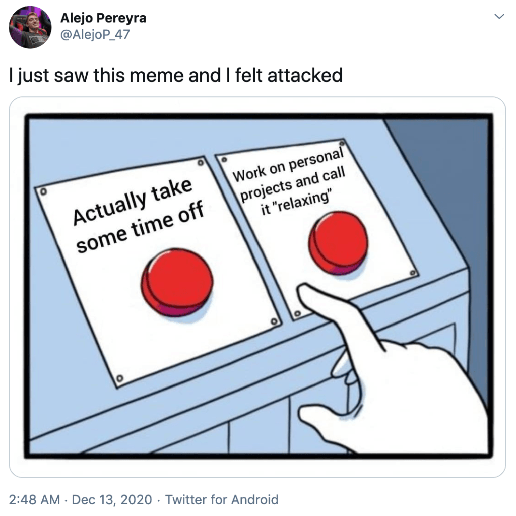That’s it! Binge a show! Read a book! Play a game! Don’t pressure yourself to drive a ton of progress during some of your only days off during a global pandemic, okay?